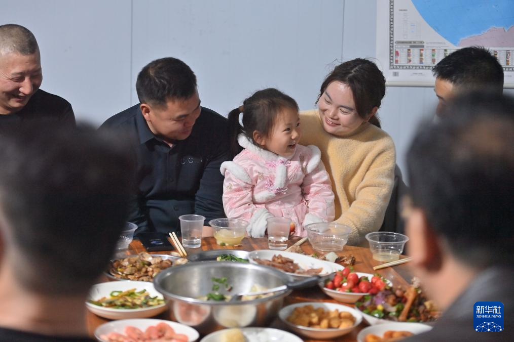 在柳州市柳江區三都鎮魚宜高速公路建設工地,中鐵二十局工人和家屬在餐廳吃團圓飯(1月22日攝)。