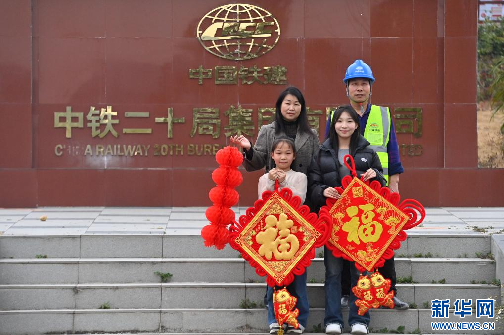 在柳州市柳江區三都鎮魚宜高速公路建設工地,中鐵二十局工人陳鵬和妻女合影(1月24日攝)。