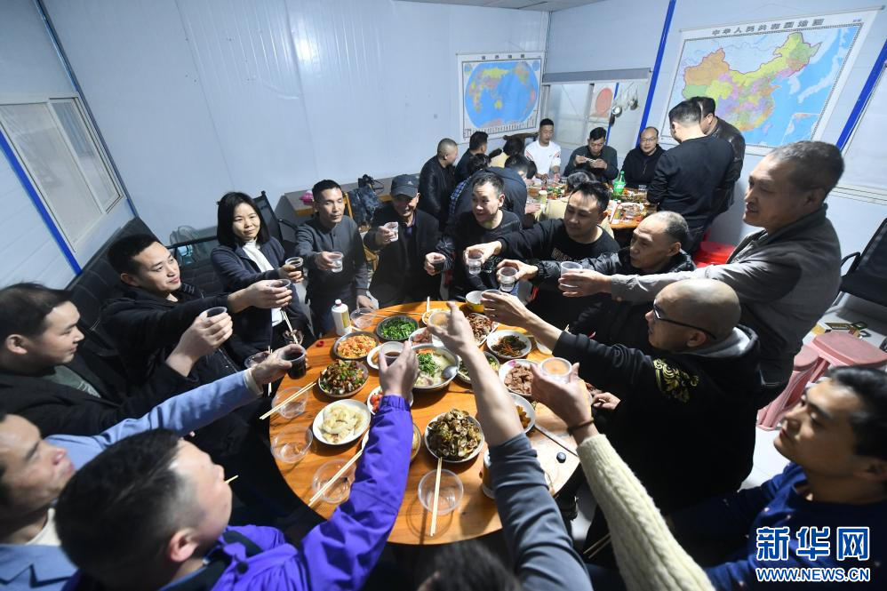 在柳州市柳江區三都鎮魚宜高速公路建設工地,中鐵二十局的工人和家屬在吃團圓飯(1月22日攝)。