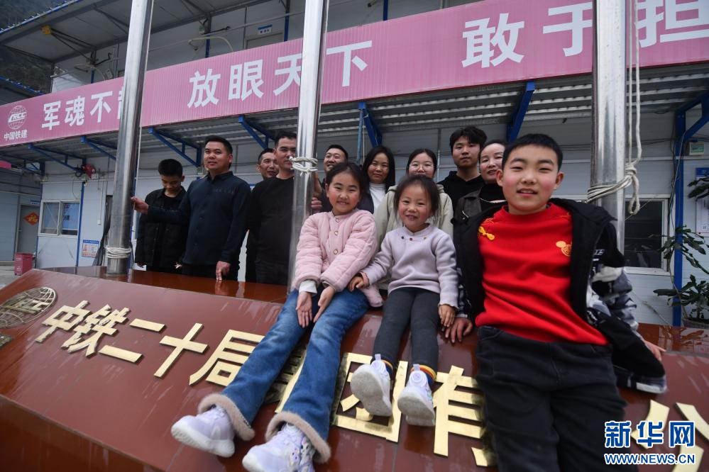 在柳州市柳江區三都鎮魚宜高速公路建設工地,中鐵二十局的工人和家屬合影(1月22日攝)。