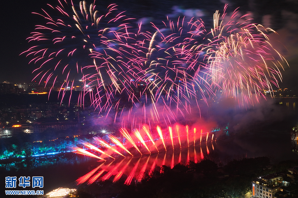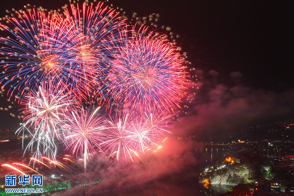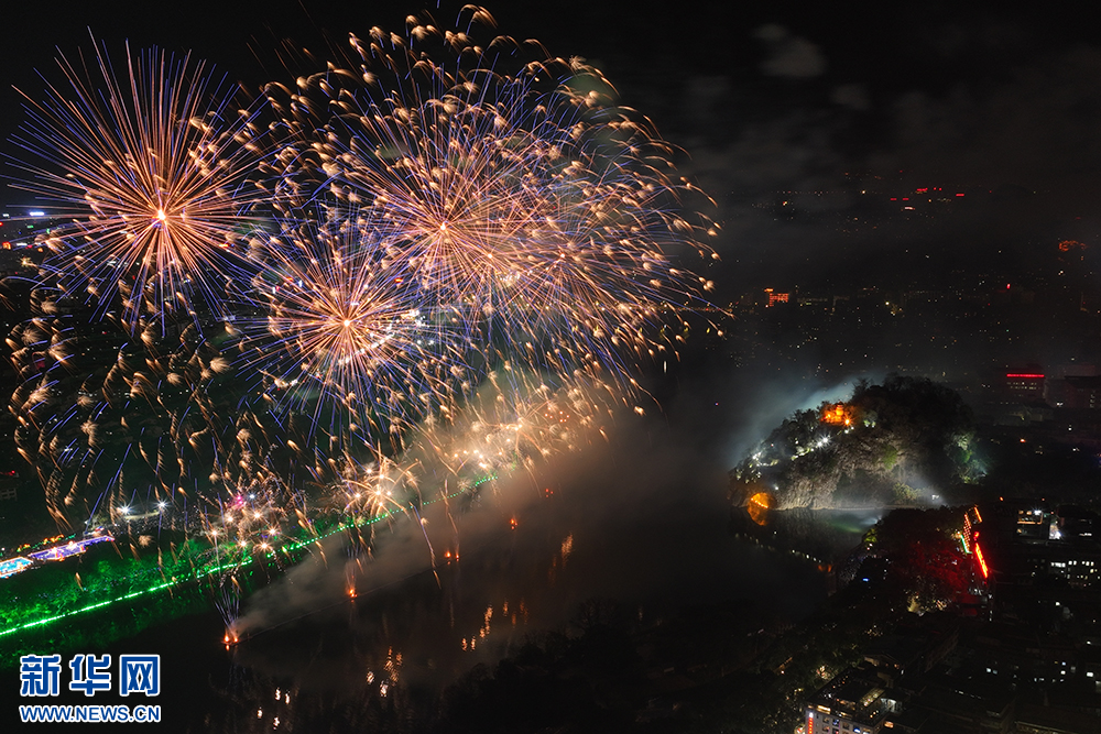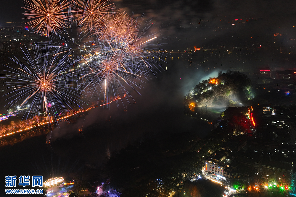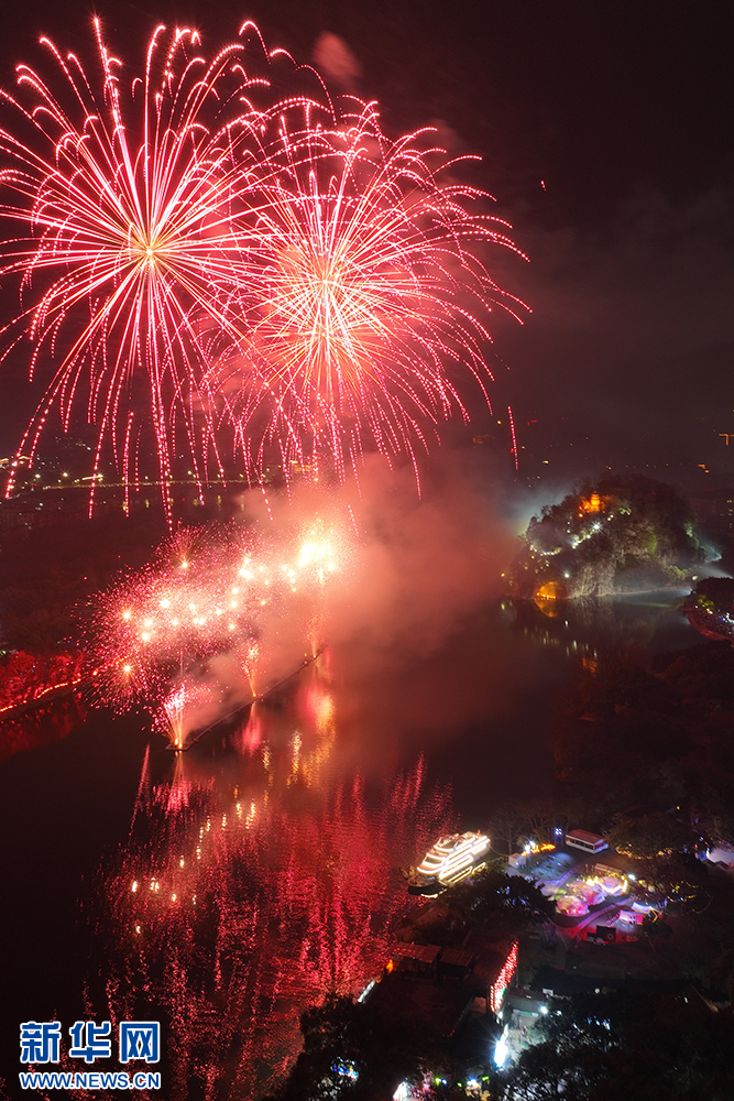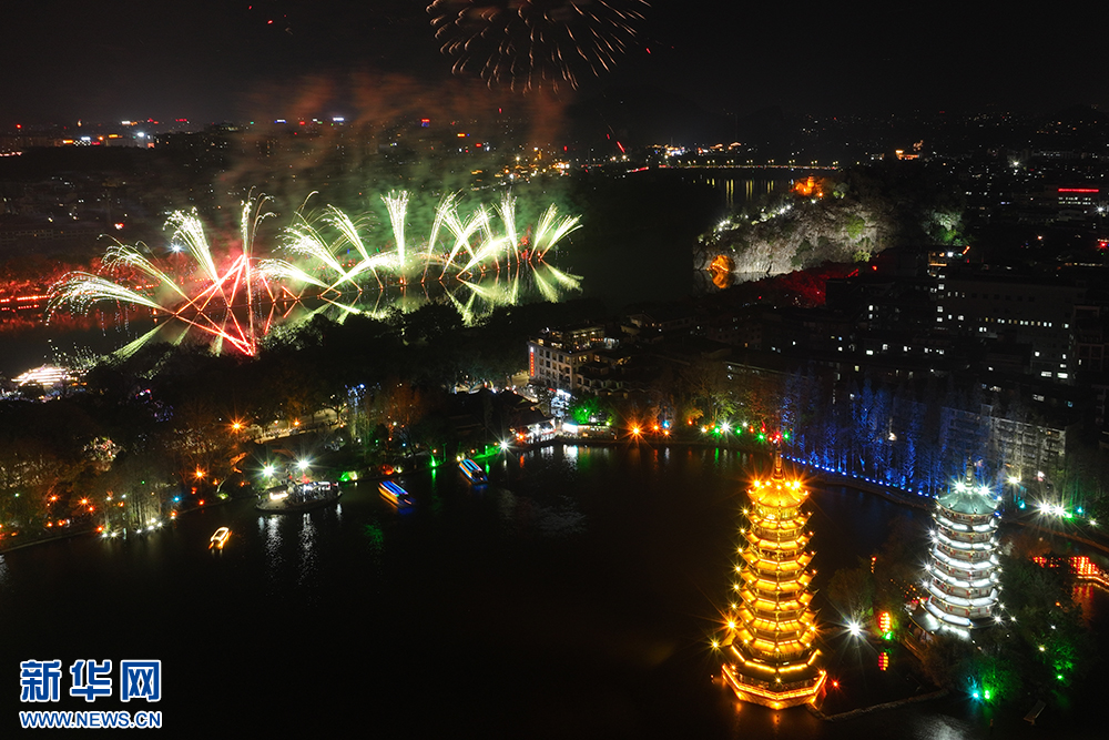 1月29日(大年初一)晚,主題為“焰火迎新春·山水展風華”的焰火秀在桂林舉行。絢麗的焰火點亮夜空,與象鼻山、日月雙塔交相輝映,讓山水甲天下的桂林展現多元魅力。