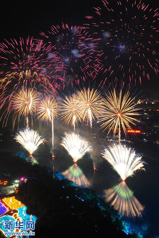 圖為無人機拍攝的絢麗的山水焰火秀(新華網發 劉崢 攝)