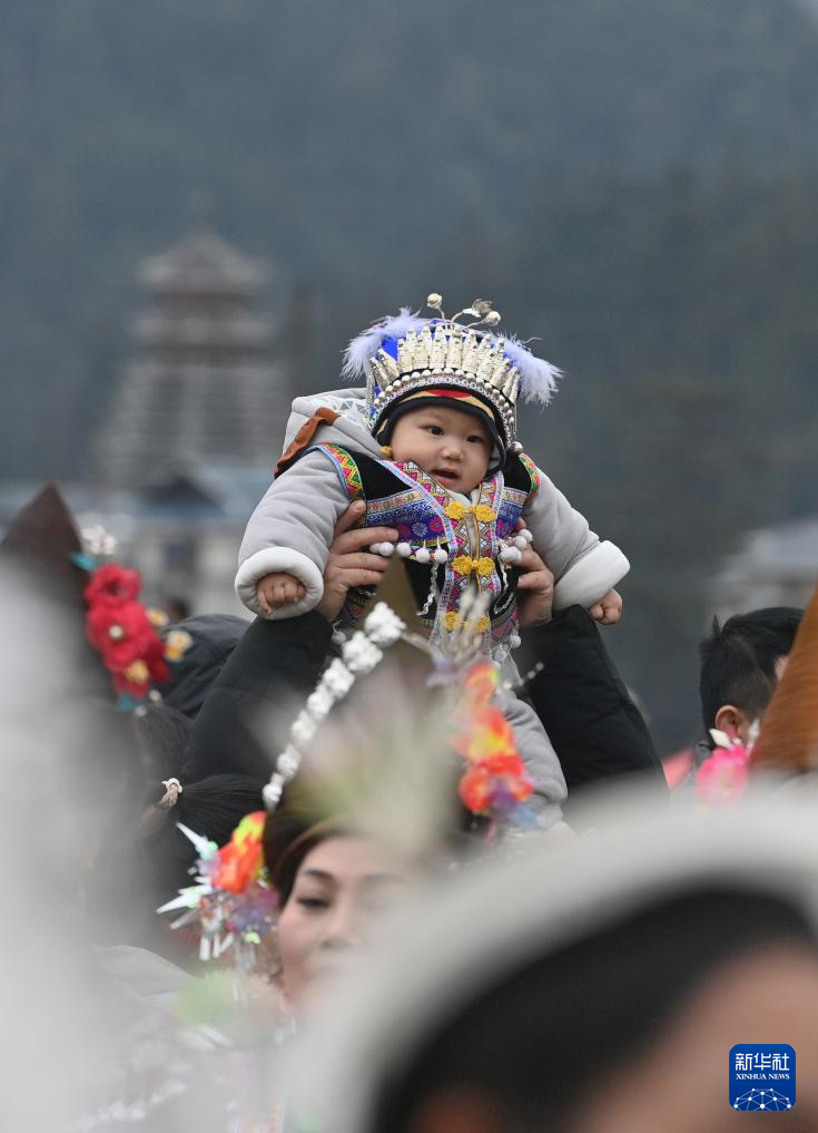 2月10日,小朋友在柳州市融水苗族自治縣安太鄉“十三坡會”上觀看蘆笙踩堂舞表演。