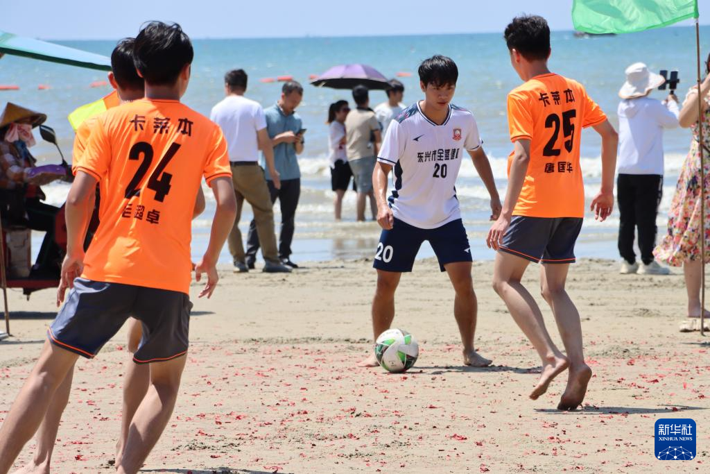 球員們在海邊的灘涂上踢球。(東興市融媒體中心供圖)