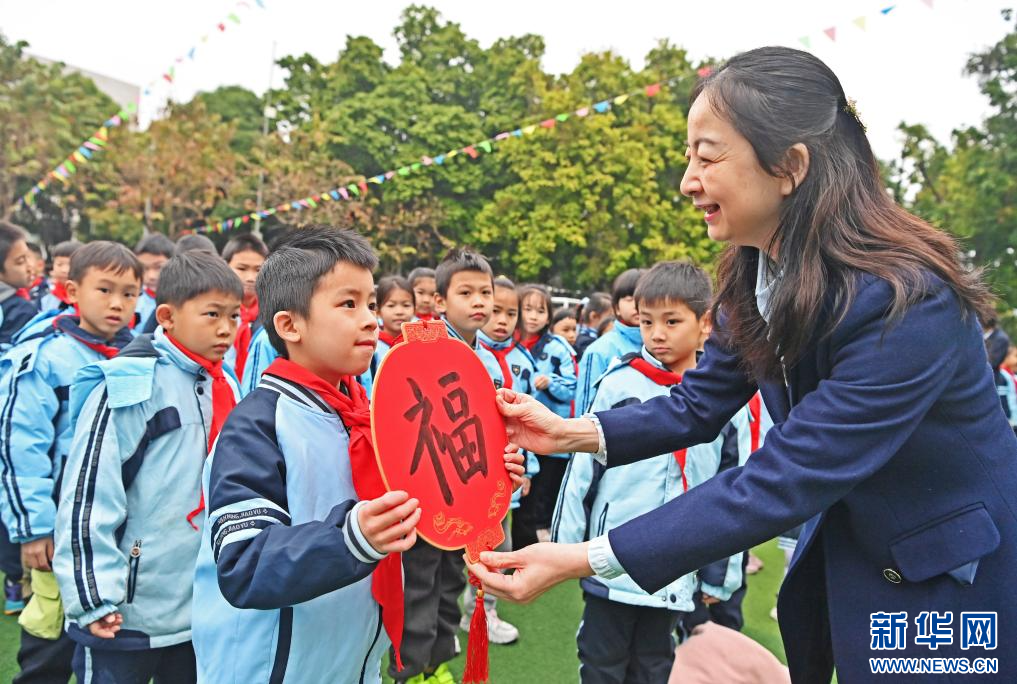 2月17日,南寧市民族大道東段小學舉行主題為“弘揚傳統鑄根基 文化傳承啟新程”的2025年春季學期開學儀式。這是校長羅瑩(右)給孩子送“?!弊?。