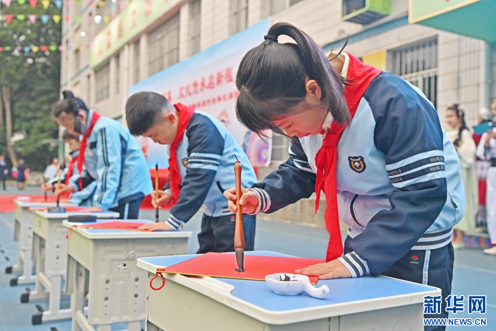 2月17日,南寧市民族大道東段小學舉行主題為“弘揚傳統鑄根基 文化傳承啟新程”的2025年春季學期開學儀式。這是孩子們在寫“?!弊?。