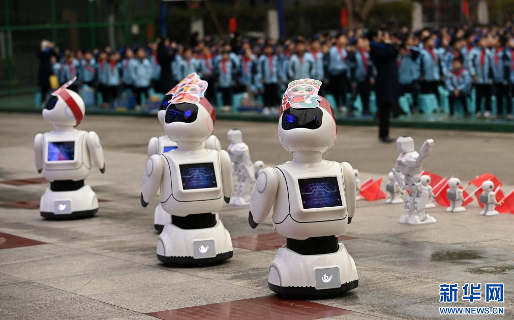 2月17日,機器人在廣西南寧市濱湖路小學開學典禮上表演。
