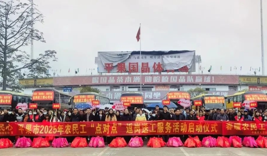 近日,百色平果市婦聯聯合市人力資源和社會保障局、市總工會、團市委開展2025年農民工“點對點”返崗送工志愿服務活動。