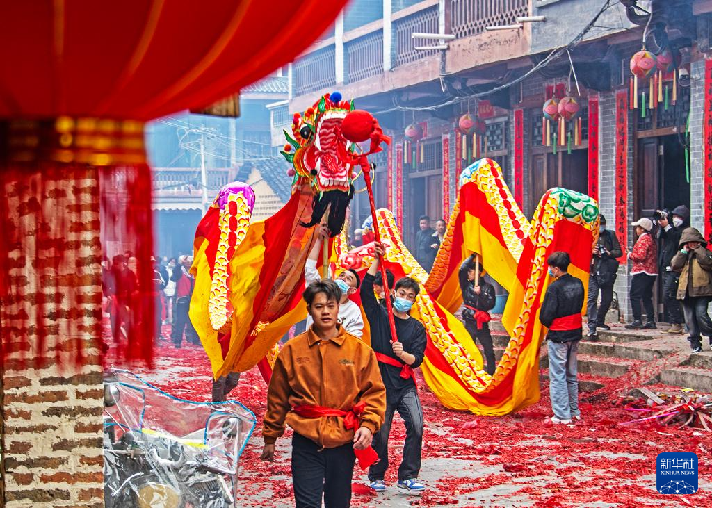 1月29日,農歷正月初一,民俗舞龍表演隊在廣西壯族自治區靖西市新靖鎮舊州街舞龍拜年。