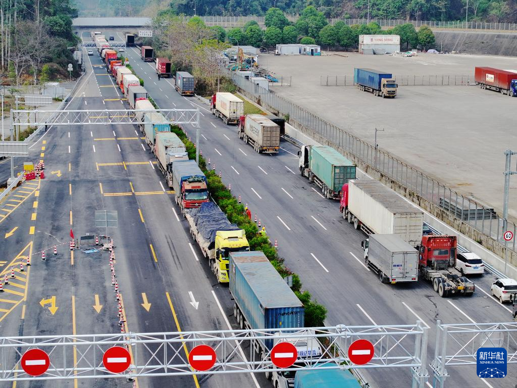 這是3月1日在廣西憑祥友誼關口岸拍攝的排隊車輛(無人機照片)。