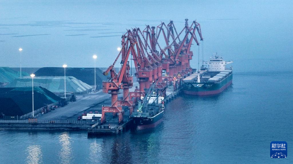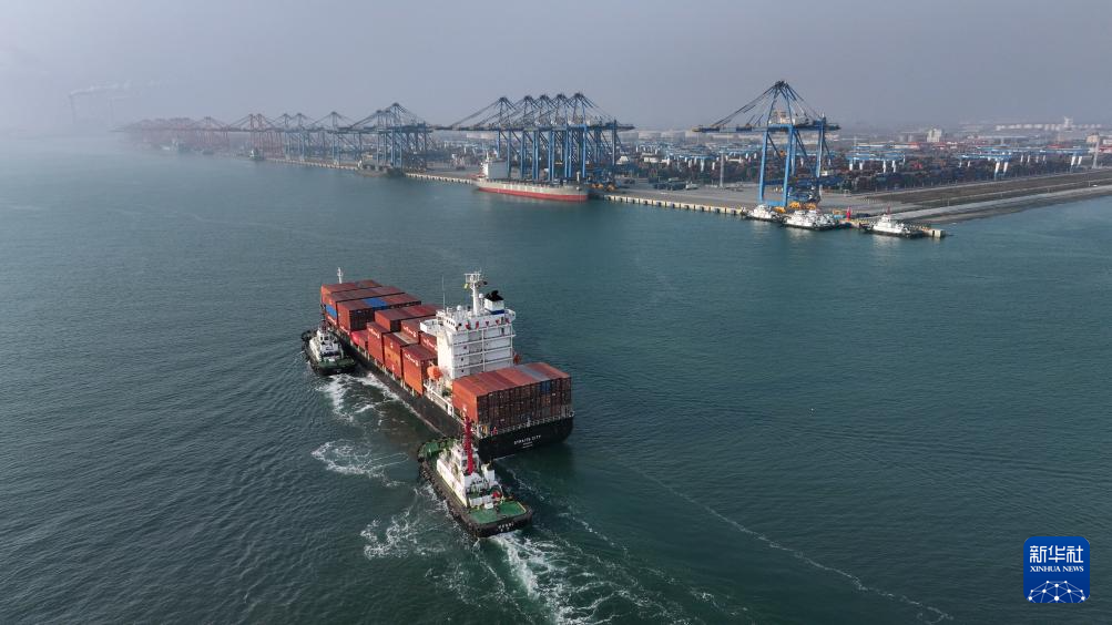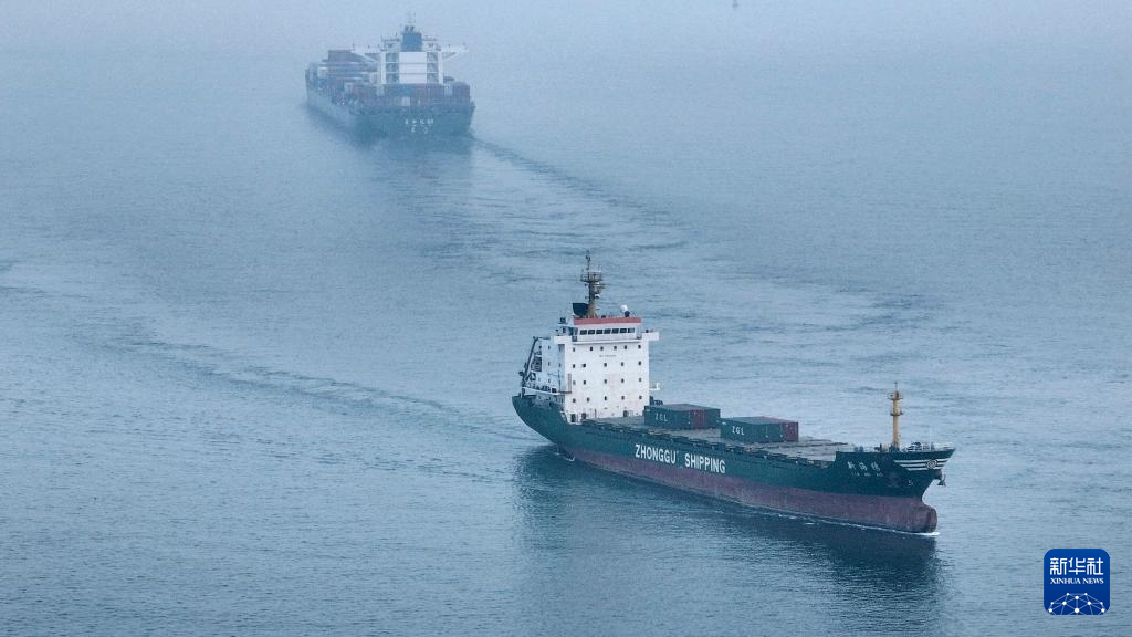 3月4日,一艘海輪準備??繗J州港下卸集裝箱(無人機照片)。