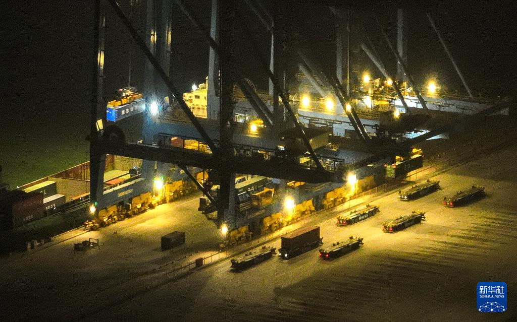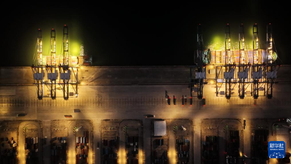 3月4日拍攝的進行夜間作業的欽州港集裝箱自動化碼頭(無人機照片)。