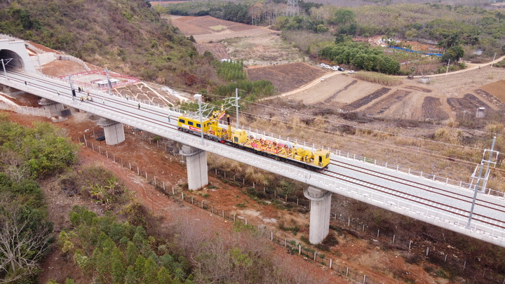 圖為南憑高鐵崇憑段正在架設接觸網導線。新華社發
