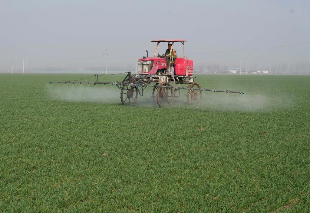 河北省邢臺市南和區閻里鄉閻里村的農民在駕駛農機給冬小麥噴灑殺菌劑。新華社發
