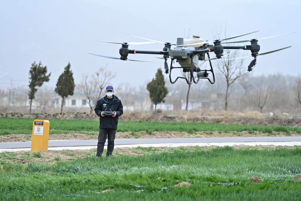 在山西省運城市鹽湖區解州鎮曲村,飛手操控無人機為麥田打藥。新華社發