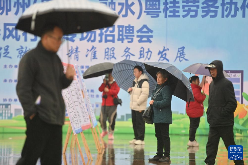 當日,廣西柳州市融水苗族自治縣舉行粵桂勞務協作暨春風行動專場招聘會,兩地60多家企業共提供數千個工作崗位,吸引眾多求職者冒雨前來應聘。