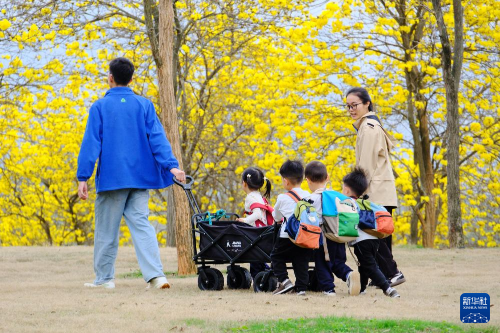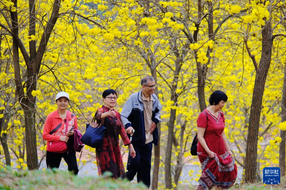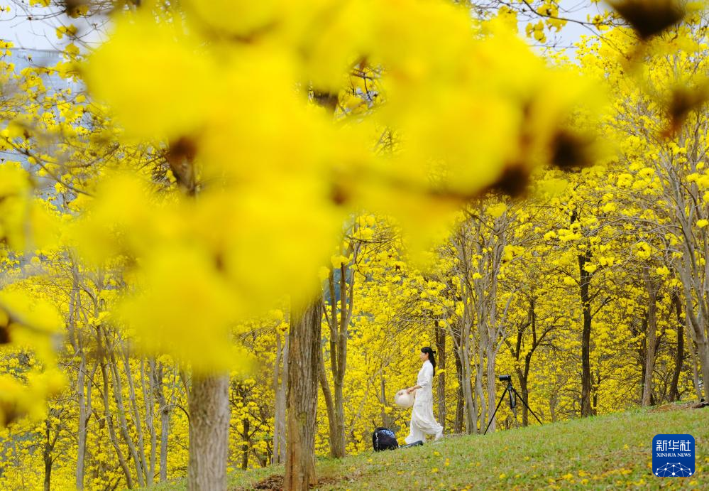 時下正是廣西南寧市青秀山風景區內的黃花風鈴木盛放時節,吸引了眾多游客前往觀賞。