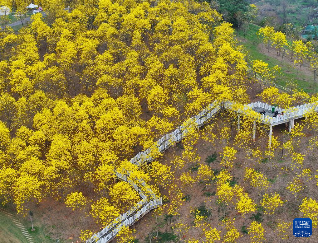 3月14日,游客在廣西南寧市青秀山風景區觀賞黃花風鈴木(無人機照片)。