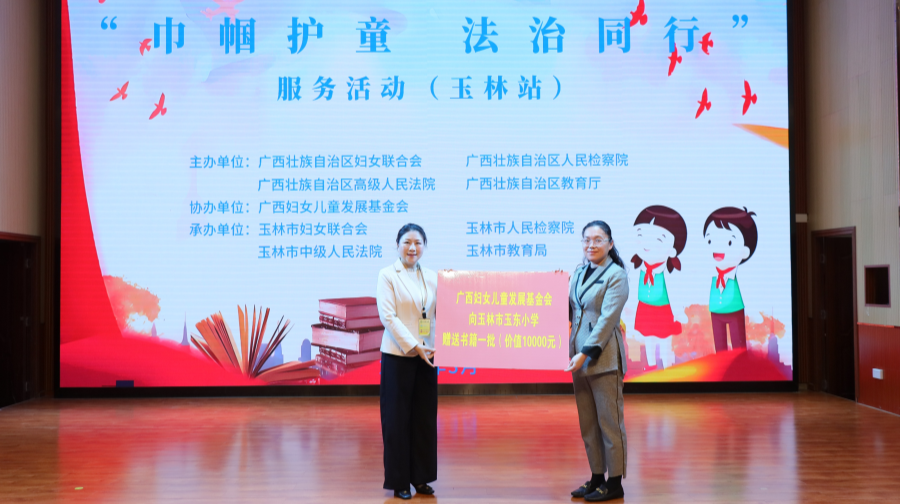 廣西婦女兒童發展基金會向玉東小學捐贈價值1萬元的法治教育及心理健康書籍。