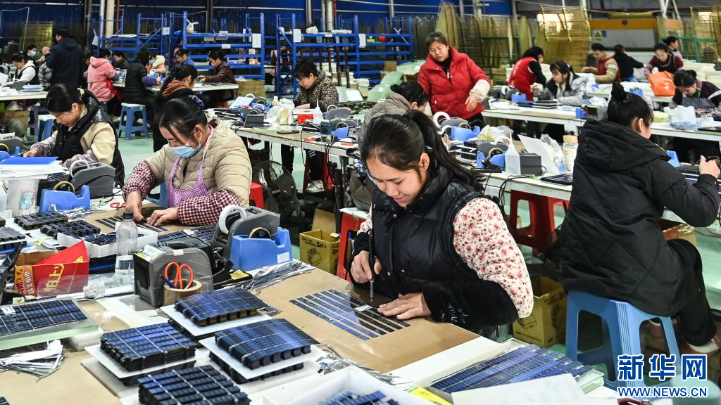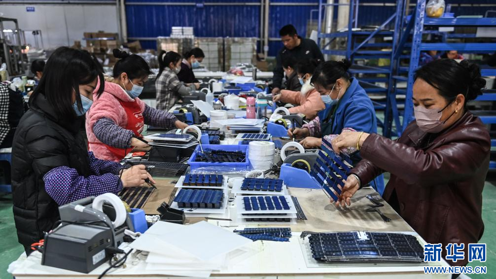 3月19日,在廣西貴光新能源科技有限公司的生產車間,工人在組裝太陽能光伏板上的電子元件。