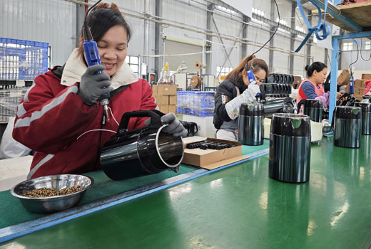流水線上工人在組裝電熱水壺。