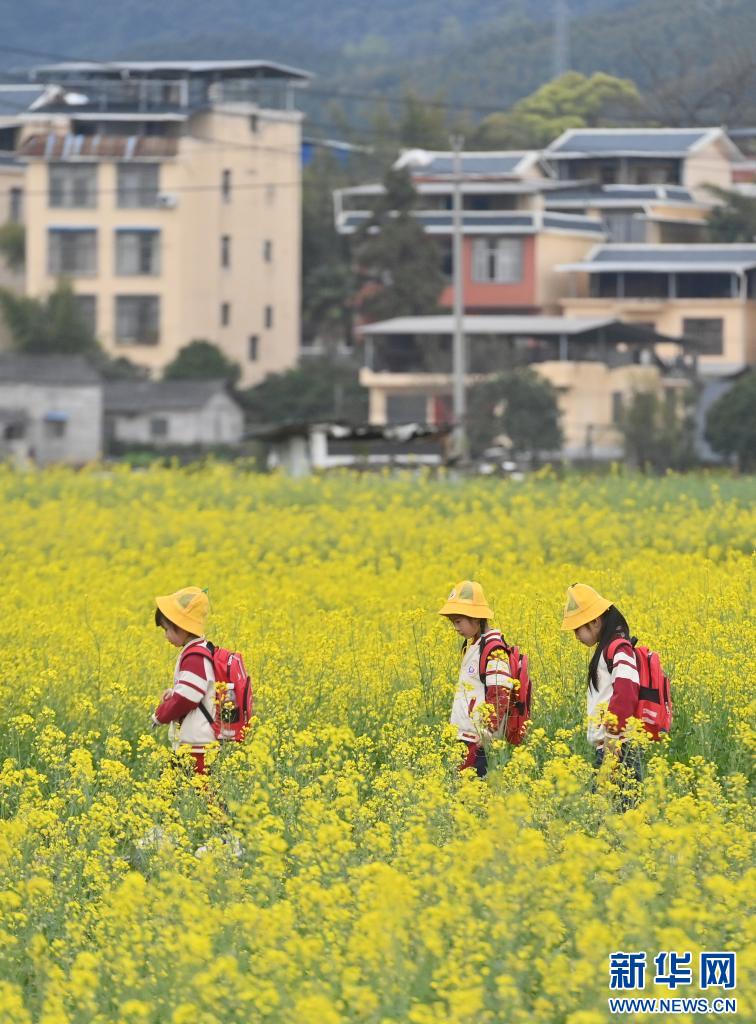在廣西融水苗族自治縣融水鎮新國村,小朋友在油菜花地踏青游玩(3月21日攝)。