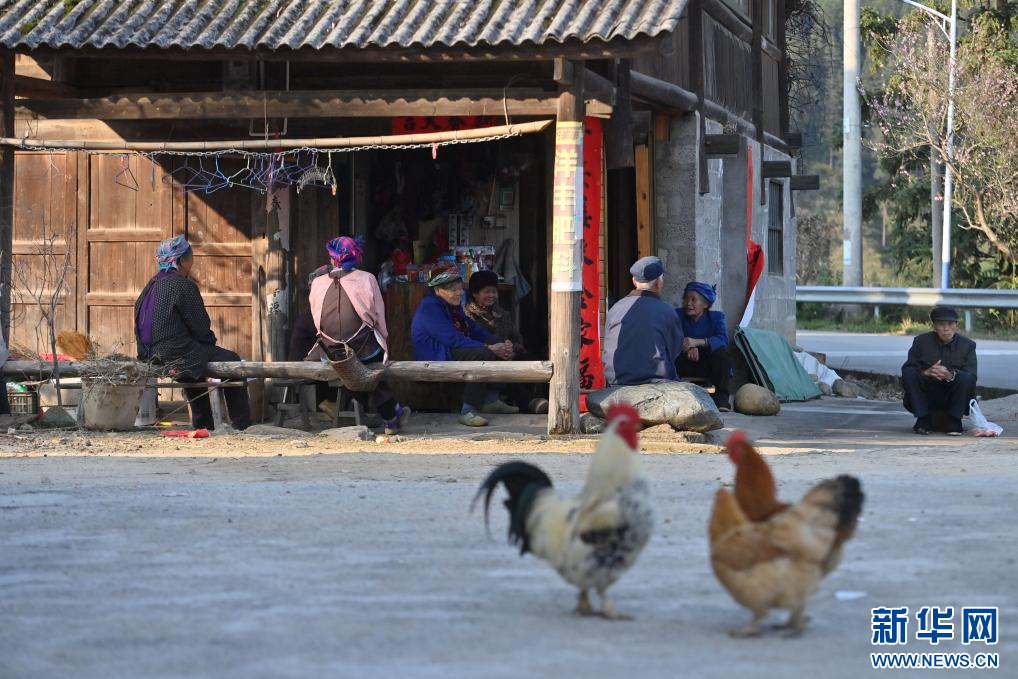 在廣西融水苗族自治縣安太鄉江竹村,勞作歸來的村民們在村口聊天(3月20日攝)。