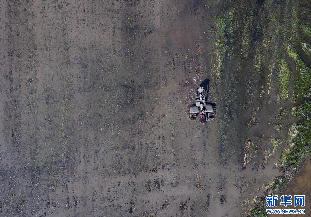 在廣西融安縣潭頭鄉新桂村,村民在田間勞作(3月21日攝,無人機照片)。