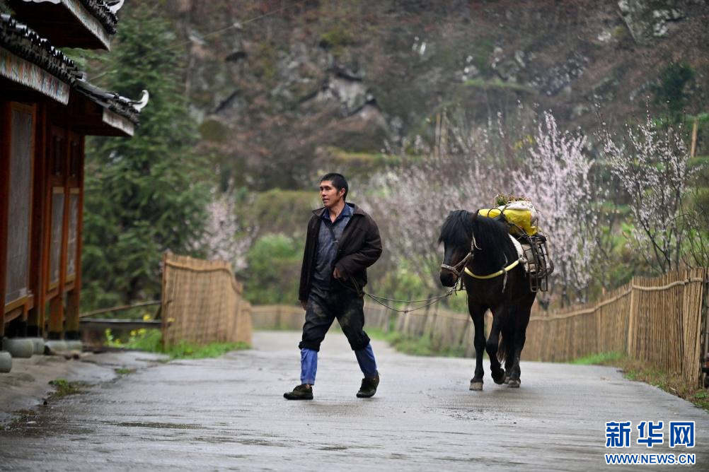 在廣西融水苗族自治縣桿洞鄉黨鳩村,村民勞作歸來(3月12日攝)。