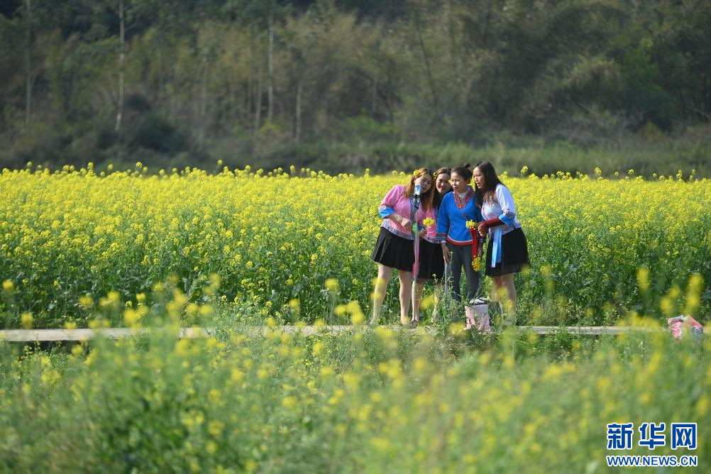 游客在廣西融水苗族自治縣融水鎮新國村的油菜花地踏青游玩(3月21日攝)。