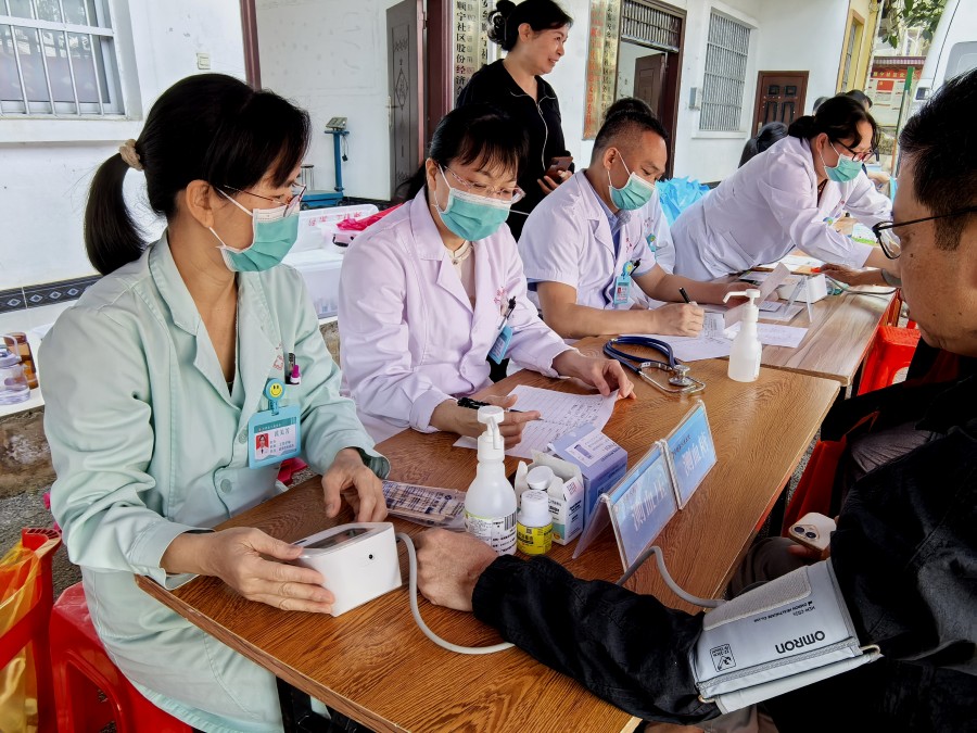 3月25日,醫務工作者在廣西寧明縣寨安鄉順寧社區為群眾進行免費測量血壓。