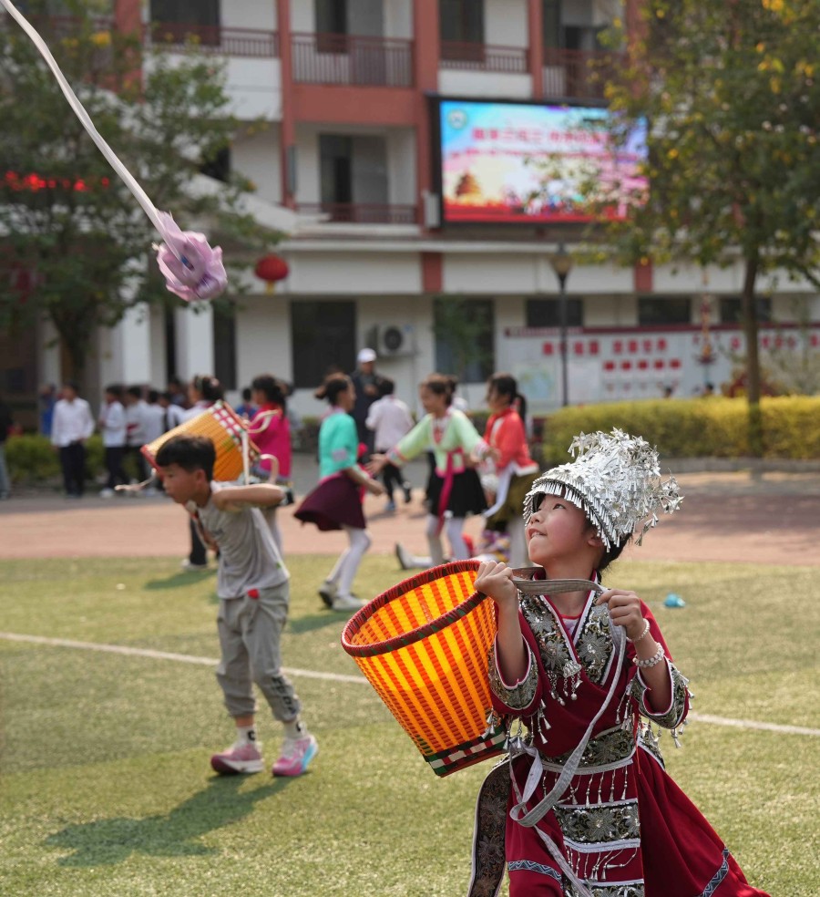 孩子們在民族趣味運動中接繡球。