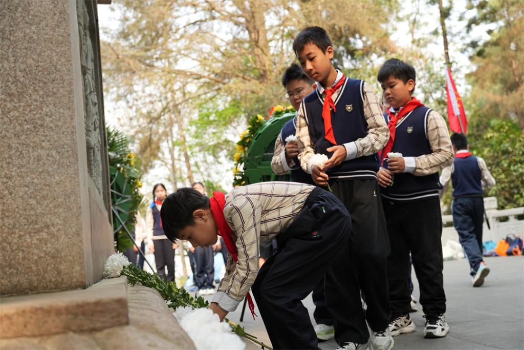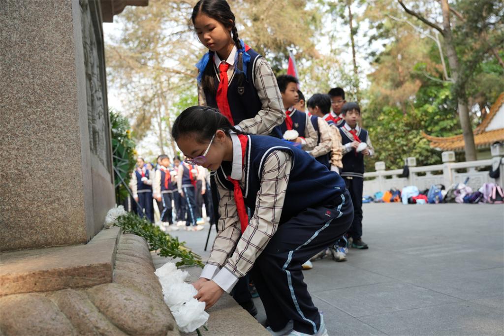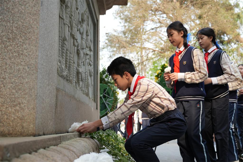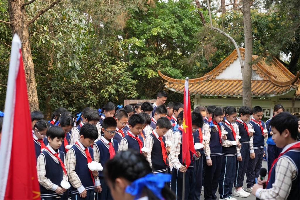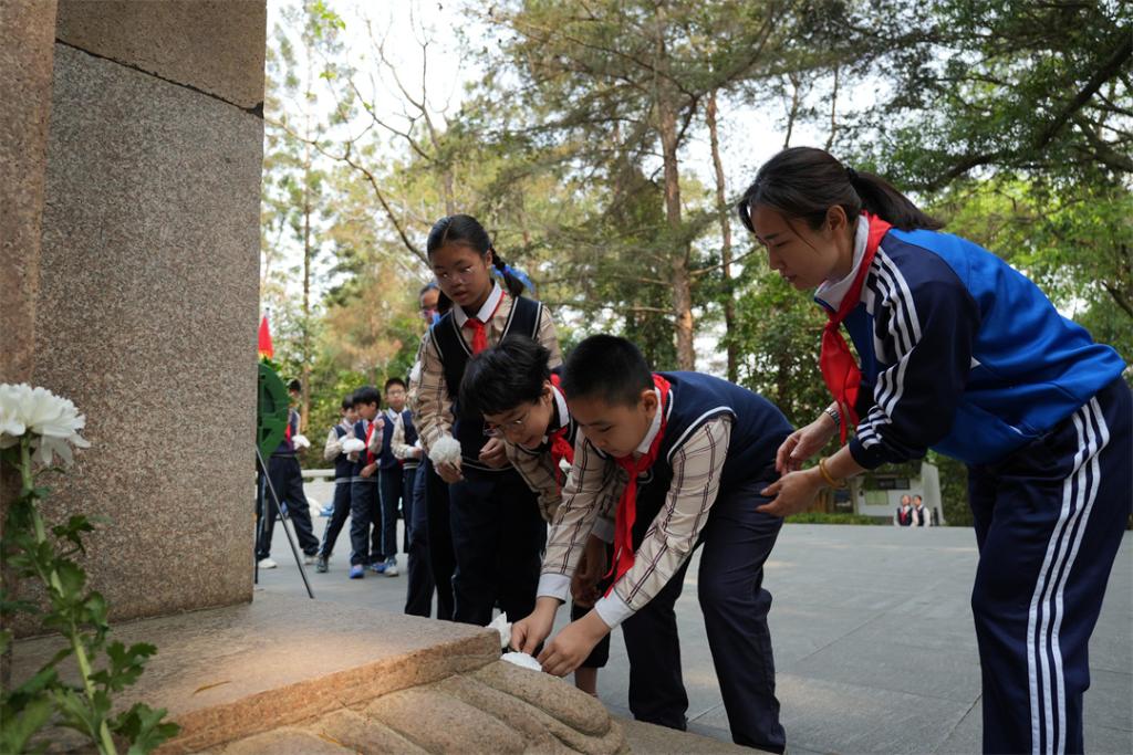 祭掃中,隊員們依次上前,將小白花輕輕放在紀念碑基座上,一朵朵白花,承載著孩子們的純真敬意,也象征著革命精神代代相傳。輕風拂過,白花如雪,無聲的對話跨越時空。