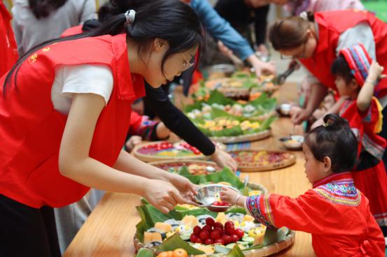 在“‘邕’愛老小新·同繪石榴情”民族文化展示活動現場,民歌旋律與孩子們的歡笑交織,家長與孩子圍坐在非遺體驗區制作五色糯米飯和艾葉糍粑,熱氣蒸騰中傳遞著傳統與童真的交融。