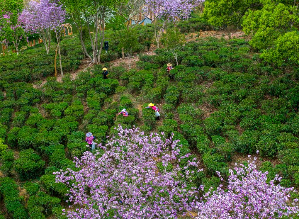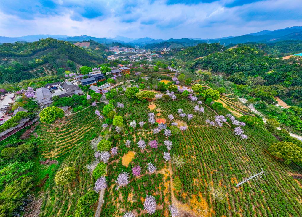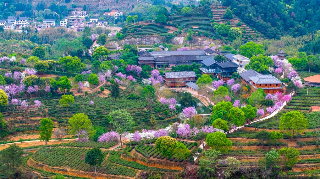 2025年4月9日,廣西梧州市蒼梧縣六堡鎮茶園內紫荊花盛開,與遠山、民居交相輝映,呈現出一幅自然和諧的鄉村畫卷,美不勝收。(無人機照片)CICPHOTO/何華文 攝