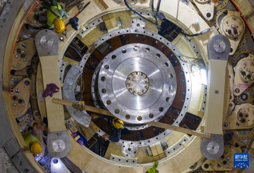 4月15日,建設者在南寧抽水蓄能電站廠房內進行安裝作業(無人機照片)。