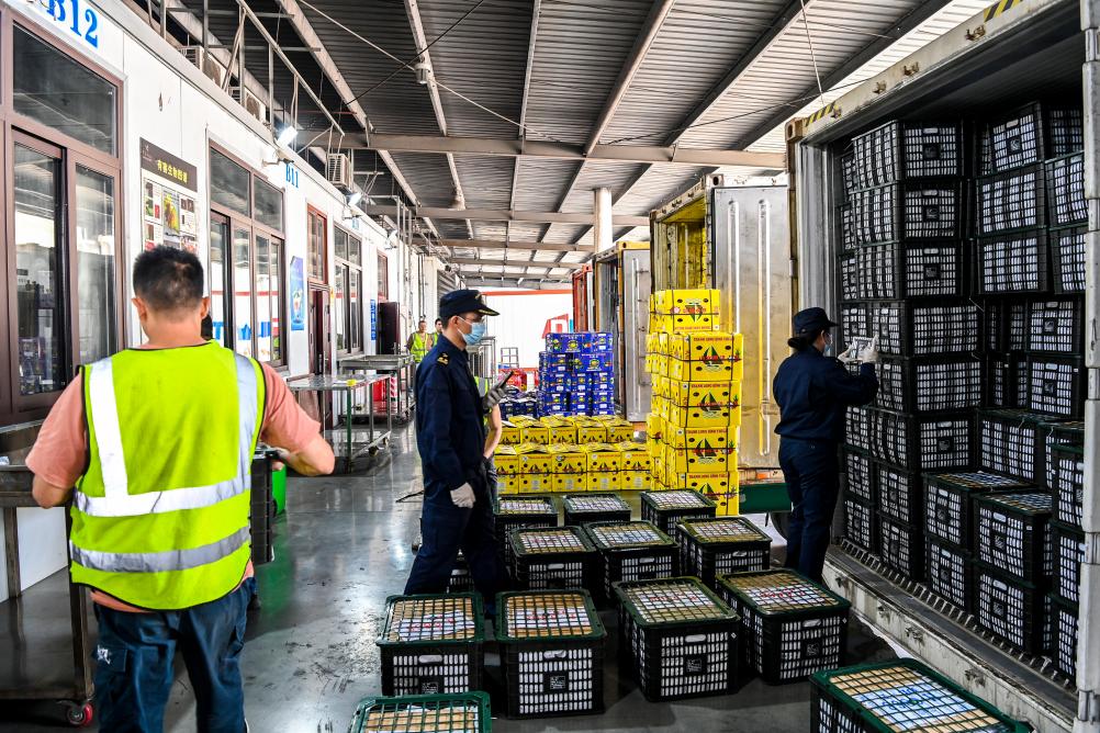 在廣西東興口岸,邊檢人員對進口的鮮活水產品進行查驗(3月18日攝)。新華社記者 曹祎銘 攝