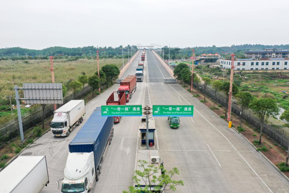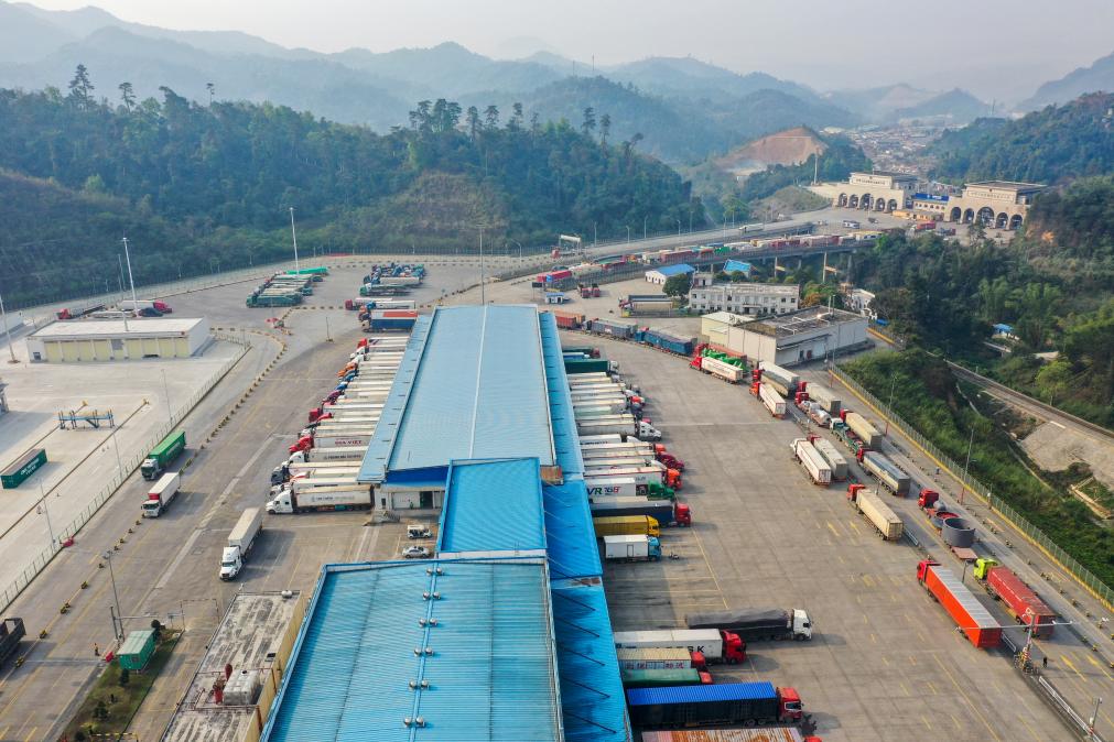在廣西憑祥友誼關口岸,裝載著來自中國和東盟國家特色農產品的貨車通過口岸(3月21日攝)。新華社記者 曹祎銘 攝