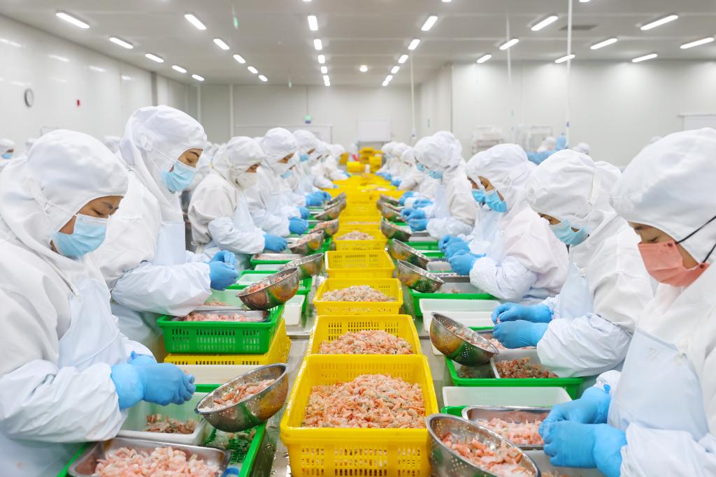 在位于武陵山區的重慶佳加榮食品有限公司的車間內,工人對經陸海聯運送達的北極甜蝦進行加工處理(4月19日攝)。新華社發(楊敏 攝)