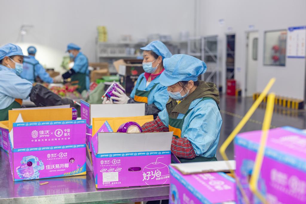 位于重慶國際物流樞紐園區內的鑫榮懋果業公司的員工在逐個檢查從泰國進口的椰青品質是否合格(4月19日攝)。新華社記者 黃偉 攝