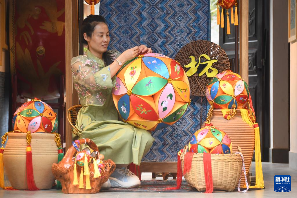 王秀芬如今已成為繡球制作技藝的市級非遺傳承人。談起繡球文化,王秀芬似乎有說不完的話?!袄C球在古代是男女之間的定情信物。比如在‘三月三’,青年男女們會對唱山歌,通過拋繡球的方式傳遞愛意?!蓖跣惴遗踔粋€大大的繡球笑著說,“發展到今天,繡球已經成為友誼和祝福的象征?!?/p>