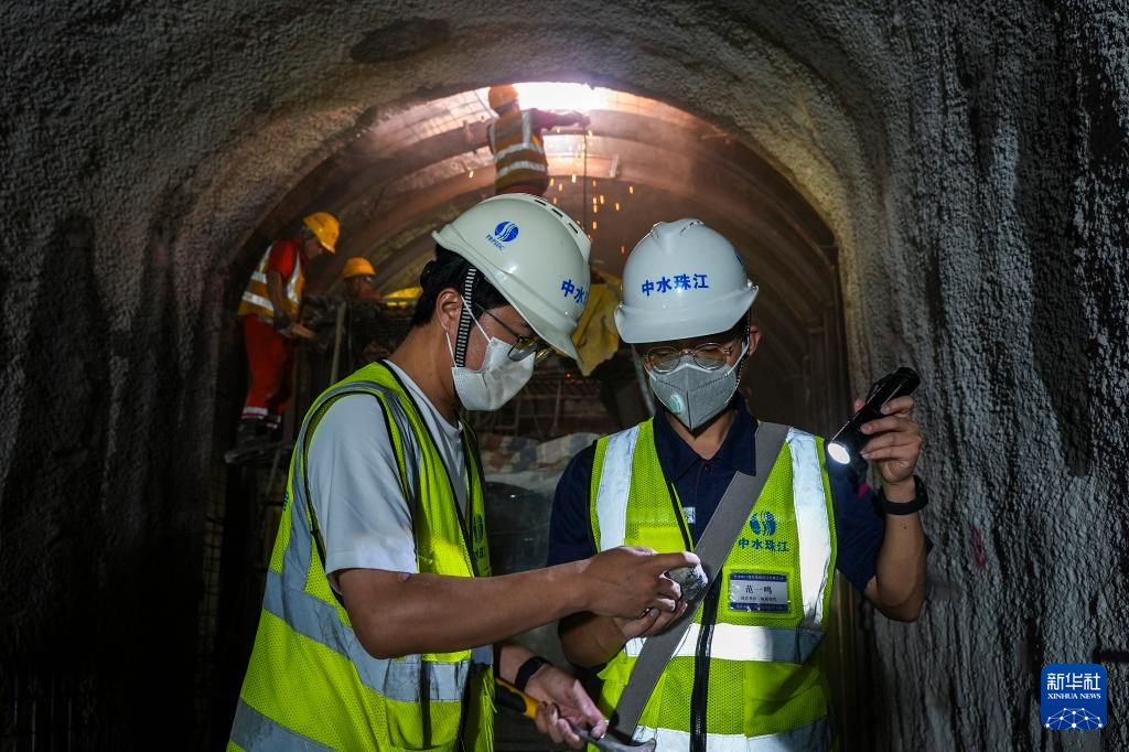 5月1日,在環北部灣廣西水資源配置工程廣西玉林市的一處建設工地,地質工程師通過巖石巖性判斷掌子面的圍巖類別。
