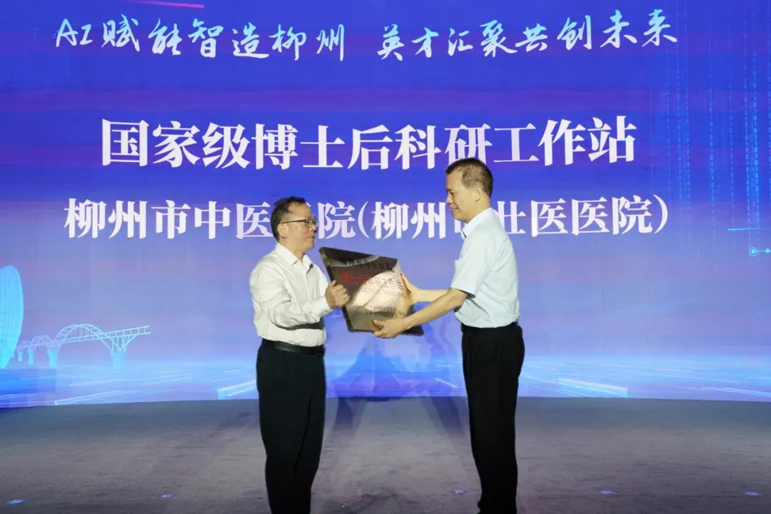 4月26日,柳州市舉行2025年“柳州企業日”“柳州工匠日”活動暨第七屆“龍城人才周”啟動儀式。儀式上,自治區人力資源社會保障廳領導為柳州市中醫醫院“博士后科研工作站”授牌,醫院黨委書記易平代表醫院上臺領取牌匾。