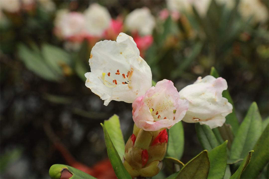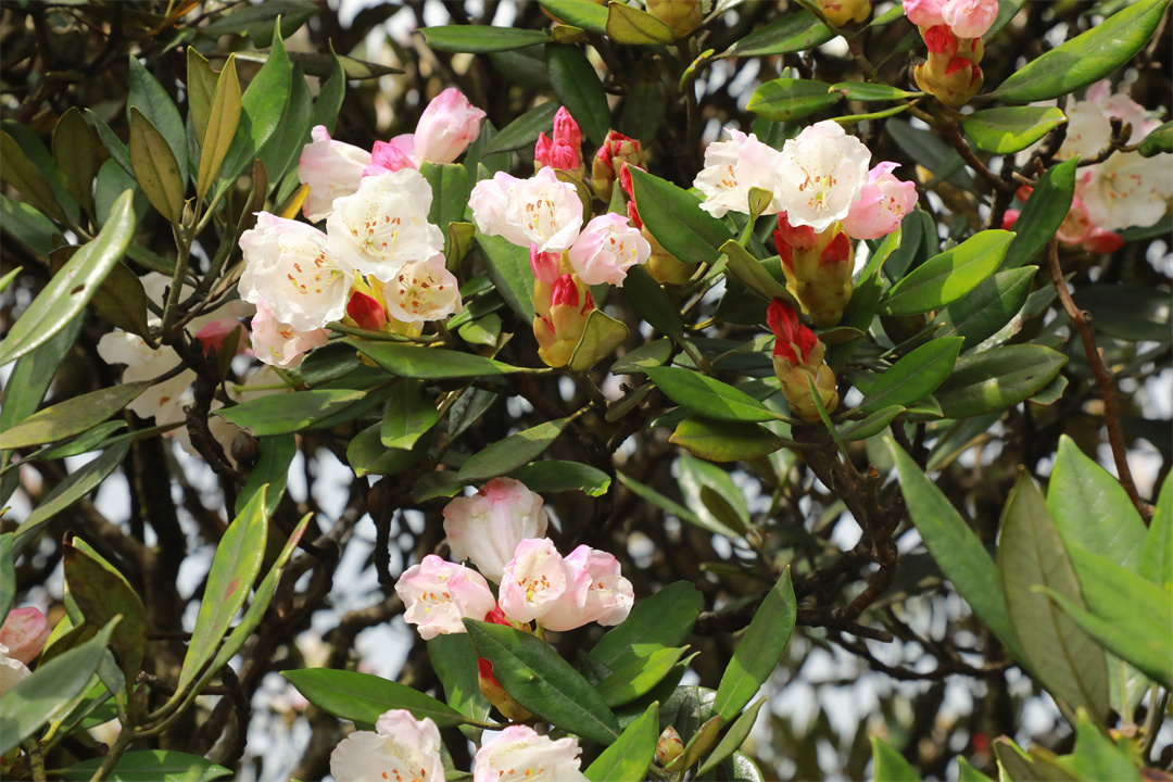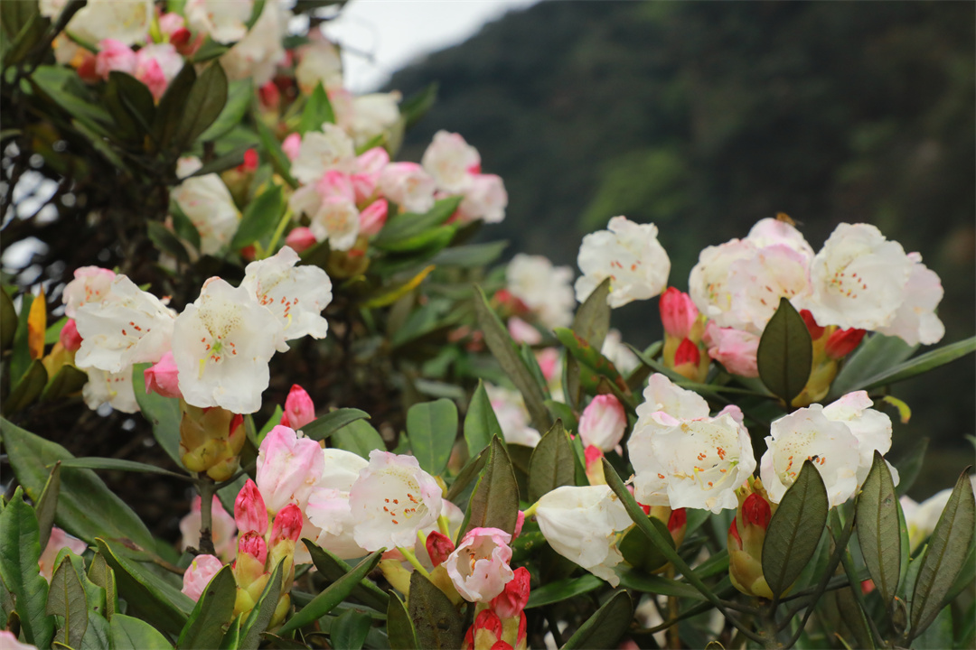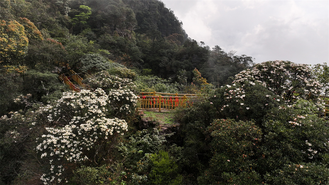 金秀圣堂山高山杜鵑分布面積約1萬畝,扎根林海峭壁之中,由瑤山杜鵑、金秀杜鵑、變色杜鵑和紅巖杜鵑組成,其中變色杜鵑占比超60%,其花色隨天氣和時間可變化為粉、紫、白、黃等多種顏色,樹齡古老,姿態各異,與繚繞的云霧相映成趣,每每山風吹拂,花浪翻滾,暗香浮動,演繹著圣堂山的無限風光。