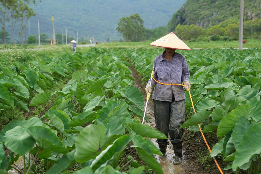 立夏時節,賀州市鐘山縣公安鎮里太香芋種植示范基地內,一株株香芋生機盎然,碧綠的葉片、壯碩的枝干傲然挺立,隨著香芋進入生長關鍵期,各項田間管護工作正如火如荼地開展,工人們正在分工協作澆水肥。