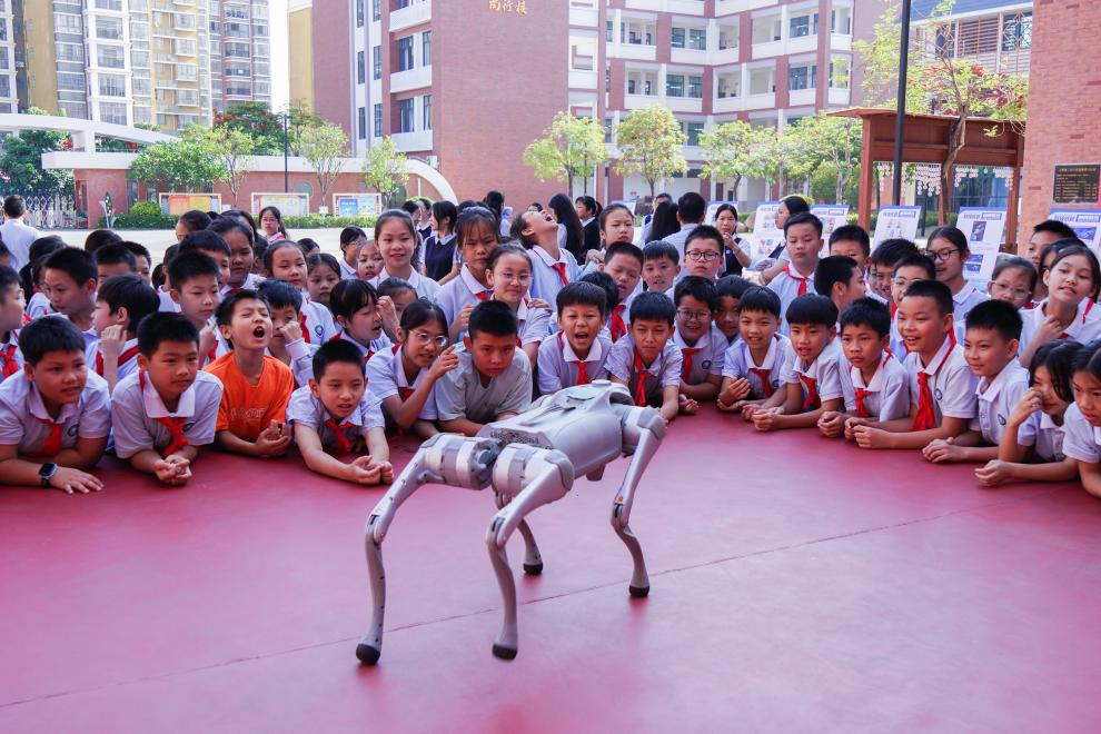活動現場,智能機器狗靈活完成跳躍、旋轉等高難度動作,引發觀眾陣陣驚嘆。由武鳴區郵政分公司策劃的“百枚郵票學黨史”“科技成就”郵票圖片展,通過200余枚珍貴郵票串聯起百年黨史和科技發展脈絡?!斑@些郵票就像微型博物館,讓孩子們在方寸之間了解我國建黨百年奮斗歷程及‘科教興國’等戰略發展脈絡,是記錄輝煌歷程、科技強國進程的獨特歷史檔案,也是全民科學教育的生動教材?!痹摴靖笨偨浝碓鴰V介紹?,F場同步開展圖書、圖書券捐贈活動,進一步豐富校園“書香陣地”建設。