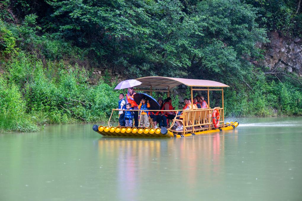 以上圖片:2025年5月10日,游客在廣西來賓市金秀瑤族自治縣長垌鄉圣堂湖景區乘坐竹筏游玩。(無人機照片)CICPHOTO/何華文 攝