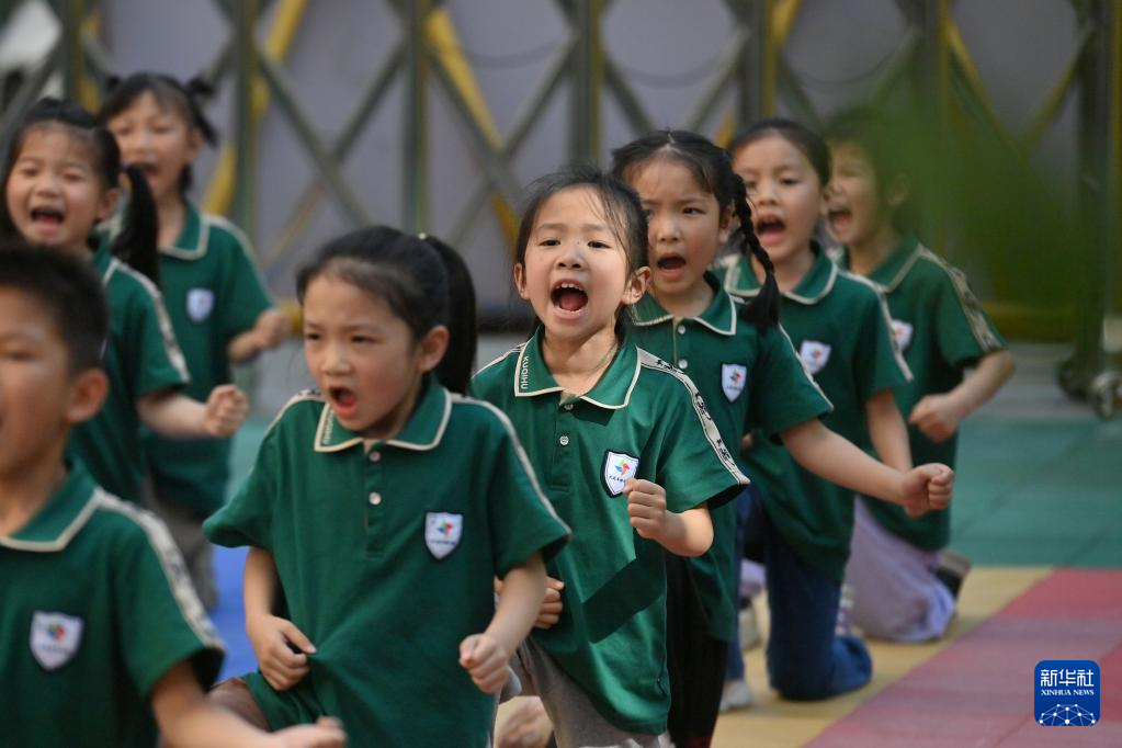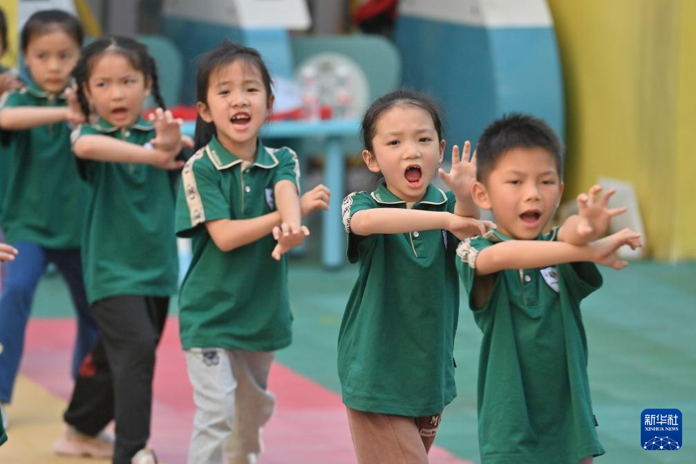 5月13日,小朋友在蒙山縣蒙山鎮大風車幼兒園練習拳術。