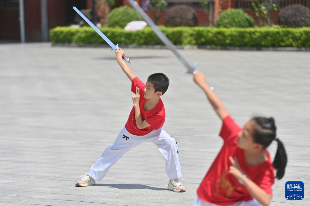 5月13日,學生在蒙山縣蒙山鎮第一小學練習劍術。