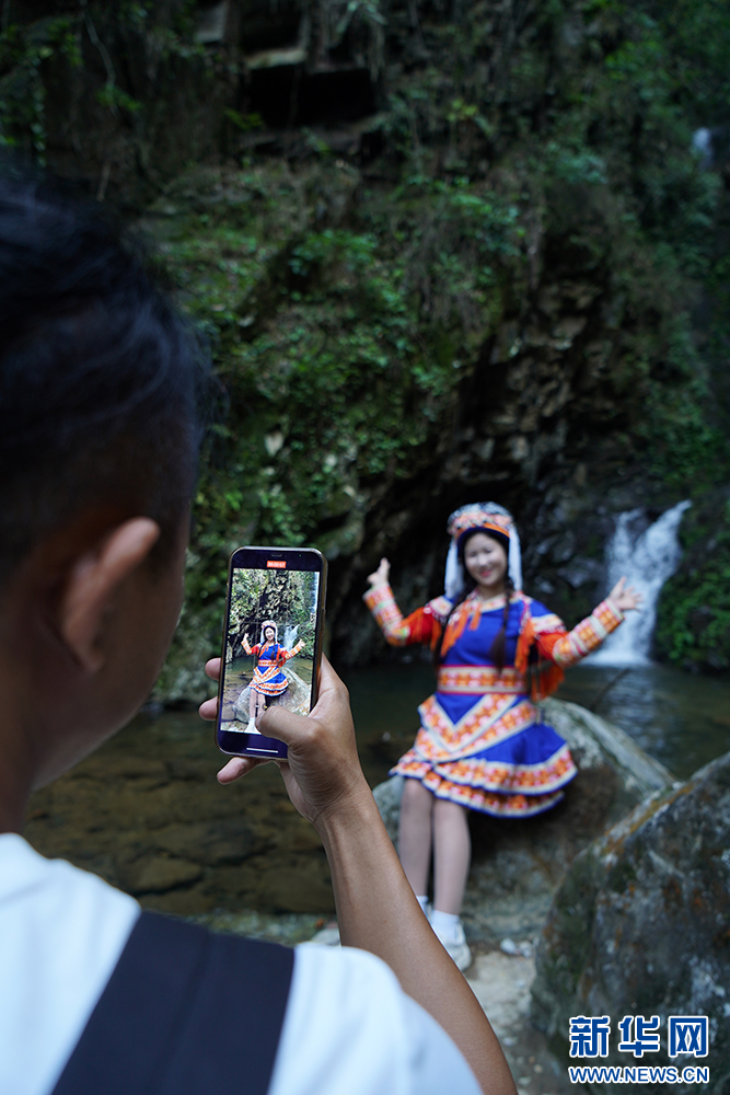 自媒體達人在青山瀑布景區拍攝視頻素材
